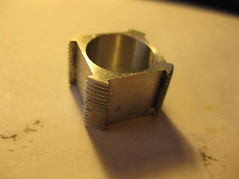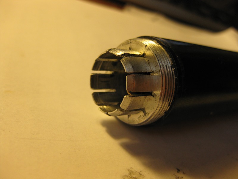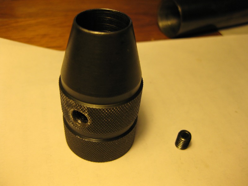 это конус, который собсна и зажимает цангу. принцип действия такой же, как у патрона дрели, зажимающего сверло)) с на всякий случай для дополнительной фиксации сделано перпендикулярное отверстие с резьбой под прижимной винтик.