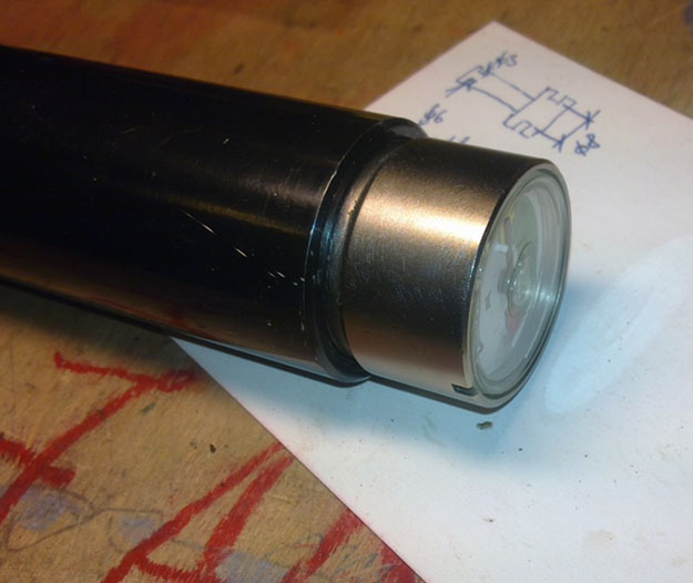 2. Разобрать резик не поцарапав его не просто, так как он очень сильно закручен и есть одна хитрость Надо начинать откручивать резик со стороны задней пробки зажав корпус в токарном станке через мягкую проставку. Я изпользовал толстый кожанный ремень. Открутив данную пробку просим автослесарей одолжить удлиннитель с шестигранником на конце. Размер шестигранника 26мм. Засовываем удлиннёный ключ через весь резик и откручиваем переднюю пробку. Вот так выглядит передняя пробка вынутая из резика.